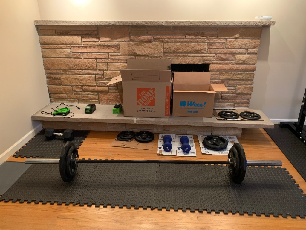 杠铃是在加州的时候买的,也是因为疫情在家工作,不方便去健身房拉杠铃练背,男人强烈要求之下买的。他背部比较容易痛,基本都靠拉杠铃来维持一下肌肉力量。这个杠铃套装有很多plates,从2.5磅到20磅都有,杠铃杆子本身也有40磅。我偶尔来做硬拉的时候只能在空杆的基础上两遍各摆上5磅的…… 背部力量还是太差了。可以看到图里还有一对10磅的哑铃和一个25磅的哑铃,等我以后有能力了再用上它们。