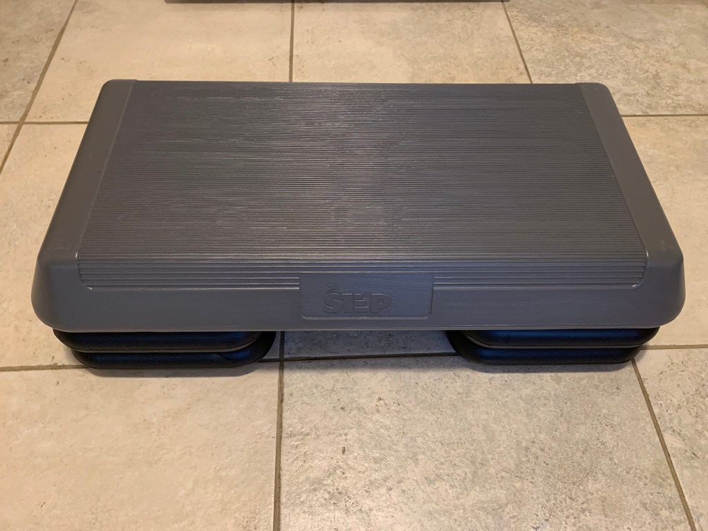 台阶是男人很早就买了,一直带着走的器具。相当于杠铃练力量,台阶练有氧。我们原来还住在亚特兰大的时候我也会用它来踩一踩跳一跳。实话实话,跳一下就挺累的了…… 器材虽小却很管用,哑铃也是这样。