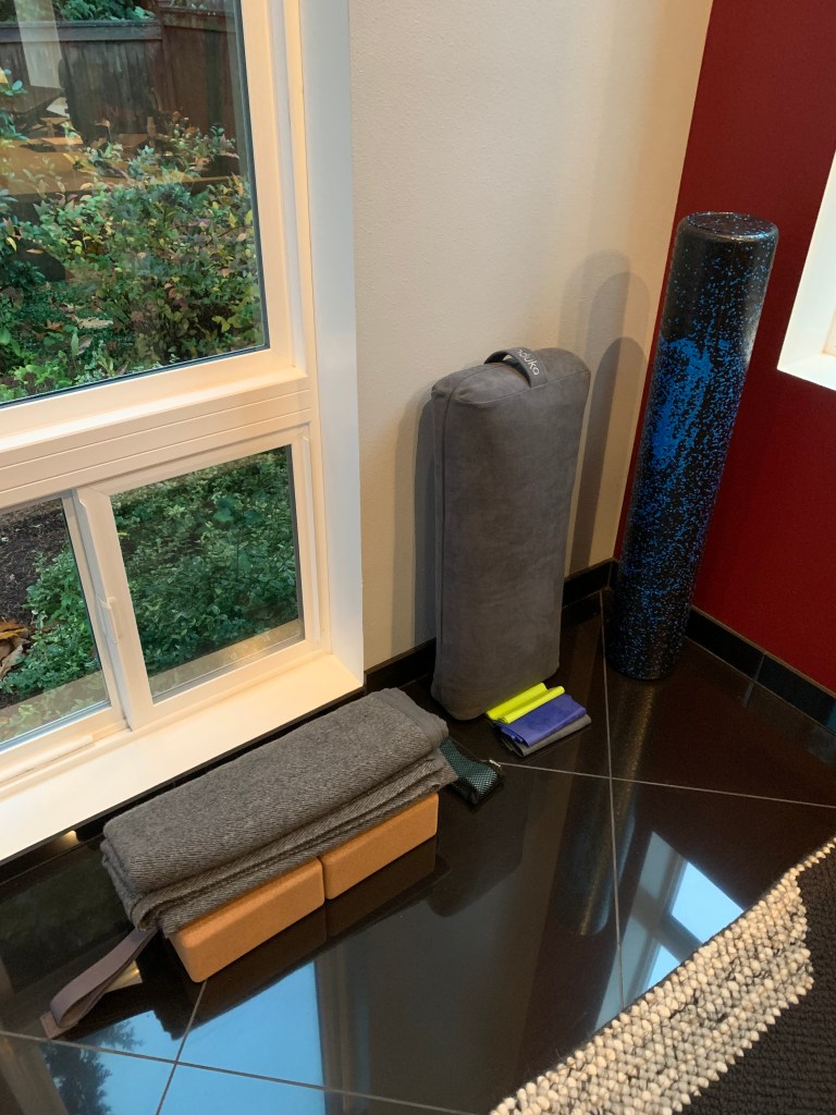 这些是其他的力量或瑜伽的辅助器材,有需要的时候会用到。比如瑜伽砖,偶尔需要用到。长条枕头也是来姨妈的时候做仰卧束角式会用到。伸展带已经基本不用了,现在柔韧性还可以,不需要它了。旁边小袋里面有五个橡胶圈弹力带,做腿部臀部力量训练会用到。再旁边的三个长条型弹力带不太用。角落里的泡沫轴偶尔放松腿部肌肉用一下(其实可能应该更经常用一用,但是按压腿部肌肉的时候真的太痛了…… 受不了……)