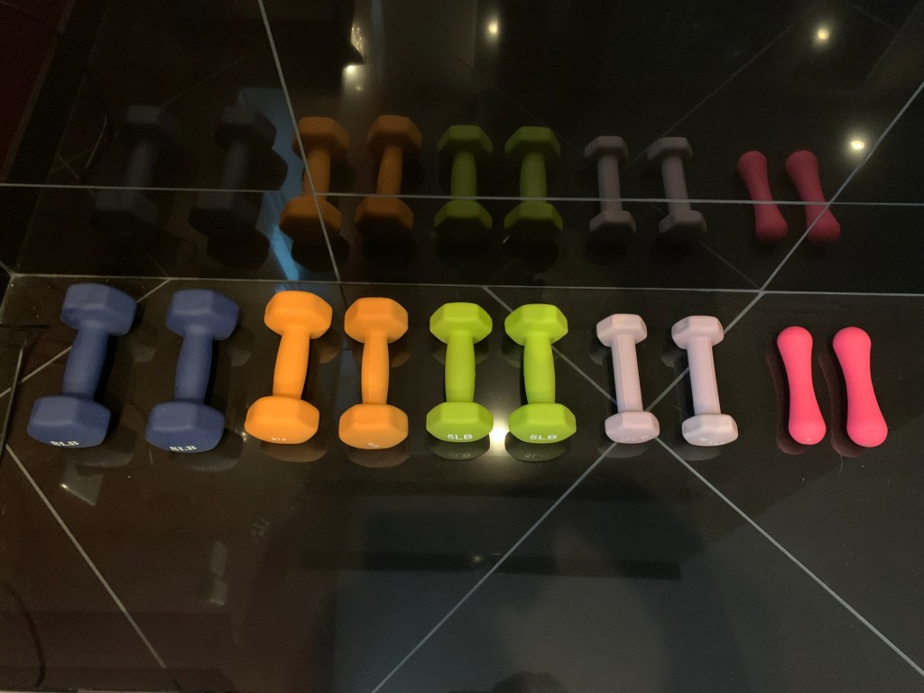哑铃一般是隔一天用一次(?)只要是做力量训练就都会用到。具体用哪一对要看具体练的是哪个部位,不同身体部位的肌肉强弱不太一样…… 这些哑铃从左到右的重量是8磅、6磅、5磅、3磅、2磅。2磅/3磅练barre或者普拉提(小幅高频摆动的那种运动),5磅/6磅练上肢和背部,8磅练硬拉或者腿部蹲起。