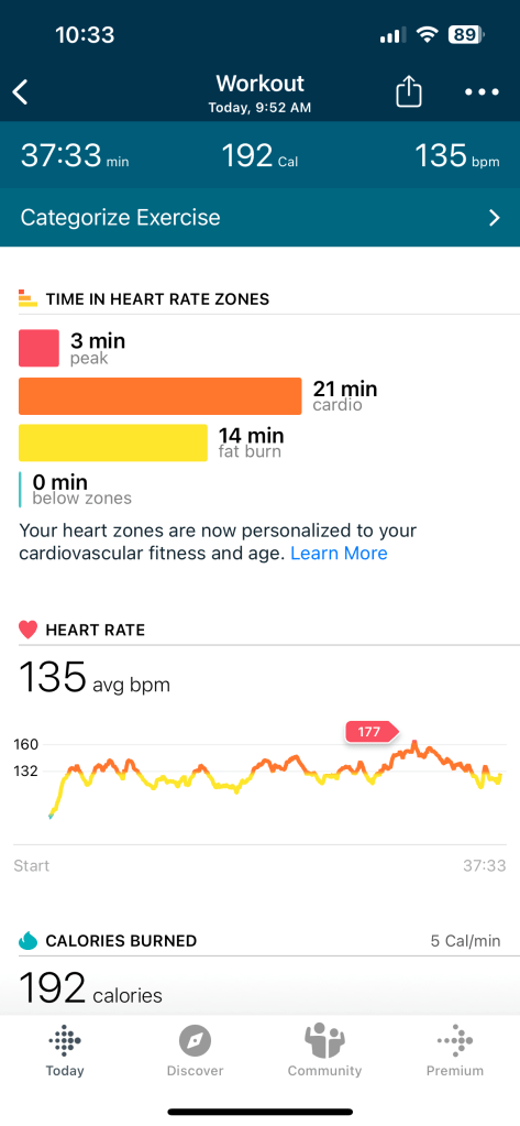 大家都在看世界杯决赛的时候,我因为既不想看书,也不想练琴,也不想出门,也不想玩字谜游戏,就打开YouTube跟着Anna 的一个all standing with weights (no jumping) 的练习练了半个多小时。刚开始的时候我用的是一对6磅的哑铃。到后面实在不行了,就换成了一对3磅的。一整个训练流畅练下来应该是半小时,但是我中间额外歇了四五次,因为真的太酸爽了。到后面大概四分之三位置的时候有一个深蹲加推举的动作,我就看着Anna做完,自己就在那try to catch up with my breath,呵呵呵,到了下一个动作再继续跟上。