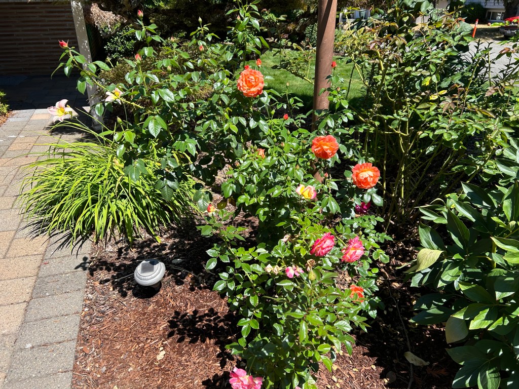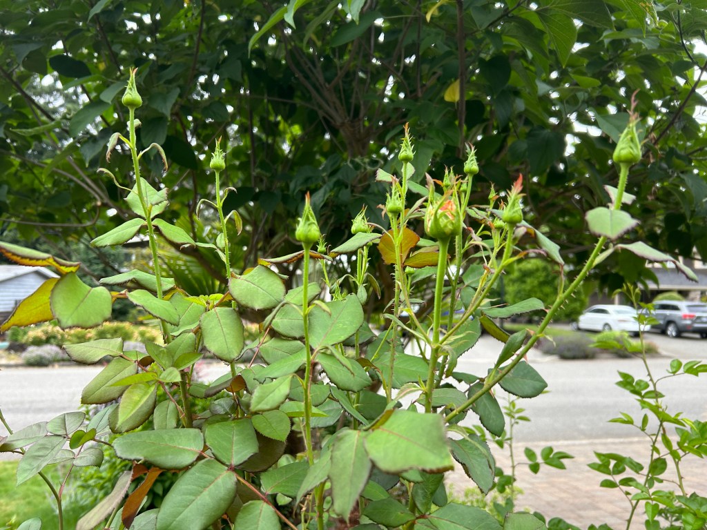 六月上旬整体修剪过的前院有浓厚香味的橙色hybrid tea月季马上又要集体开花了。这一株月季是我在学会修剪植物之后修剪的第一株月季,所以修剪之后开花效果好坏完全是在检验我的技术。六月到七月这段时间是升温的一个月,我也没有什么别的事情做,就天天趁着阳光大的时候给它们冲水,再每周施一次水溶肥。正午冲水效果立竿见影,真菌病、蚜虫、红蜘蛛都是不见踪影的。现在看着它们翠绿油亮的叶片和满满的花苞,觉得自己的劳作都获得了回报。